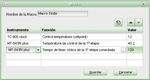 Tras rellenar el nombre de la macro haga el registro de las alteraciones que la macro debe hacer en los instrumentos. Para eso, seleccione el instrumento deseado en la columna Instrumento y en la columna Función haga un clic en el botón con tres puntos para que aparezca el listado de las funciones que se pueden alterar en el controlador. Tras seleccionar la función, teclee en el campo Valor, el valor que la función debe recibir cuando la macro se ejecutar. Es posible registrar hasta 10 procedimientos por macro.